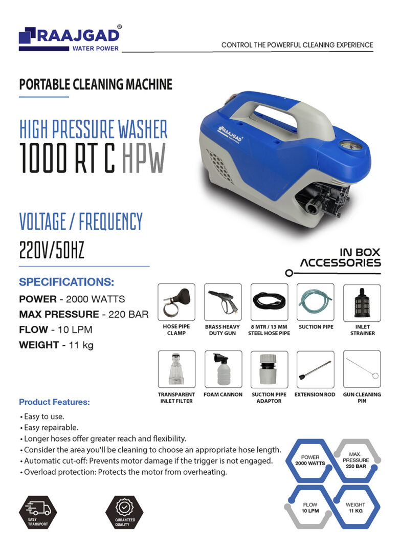 The 1000 RT C HPW is a high-performance high-pressure washer designed to deliver exceptional cleaning power for a variety of applications. With a robust 2000-watt motor powered by 220V/50Hz, this washer can handle a maximum pressure of 210 bar, ensuring effective cleaning for tough dirt, stains, and grime. It delivers a flow rate of 8 liters per minute, making it perfect for both residential and commercial cleaning needs.